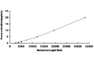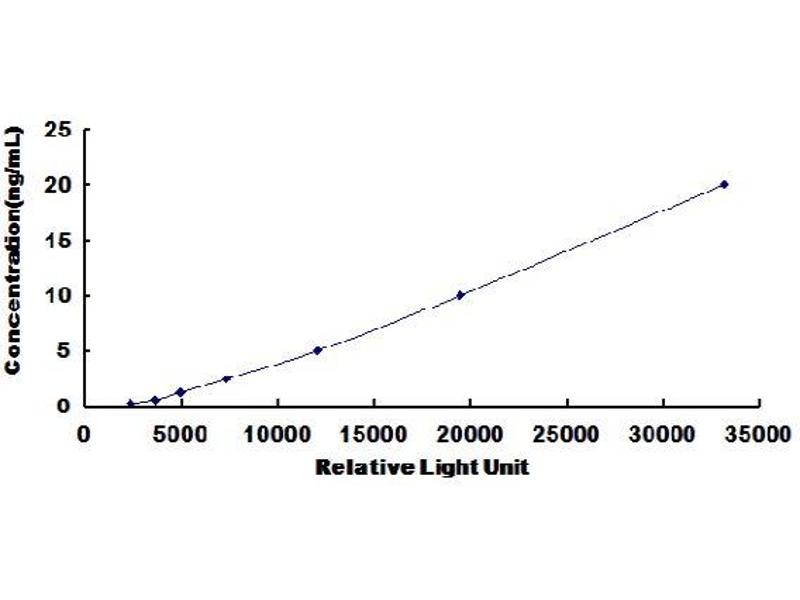 In order to make the calculation easier, we plot the RLU value of the standard (X-axis) against the known concentration of the standard (Y-axis), although concentration is indeed the independent variable while RLU value is the dependent variable. Further, in this part, in order to help the customer perform the assay more visual, we provide the customer with the raw data (not the log of data). However, plotting log of the data to construct the curve will be recommended. The RLU values of the standard curve may vary according to the conditions of assay performance (e.g. operator, pipetting technique, washing technique or temperature effects). This curve is provided for demonstration only. The customers should establish their own standard curve for each test conducted. -