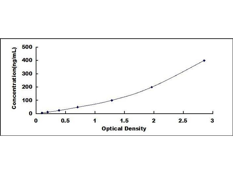 In order to make the calculation easier, we plot the O.D. value of the standard (X-axis) against the log of concentration of the standard (Y-axis), although concentration is the independent variable and O.D. value is the dependent variable. The O.D. values of the standard curve may vary according to the conditions of assay performance (e.g. operator, pipetting technique, washing technique or temperature effects). Typical standard curve below is provided for reference only. -