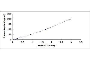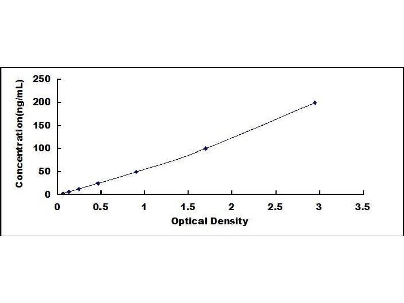 In order to make the calculation easier, we plot the O.D. value of the standard (X-axis) against the log of concentration of the standard (Y-axis), although concentration is the independent variable and O.D. value is the dependent variable. The O.D. values of the standard curve may vary according to the conditions of assay performance (e.g. operator, pipetting technique, washing technique or temperature effects). Typical standard curve below is provided for reference only. -