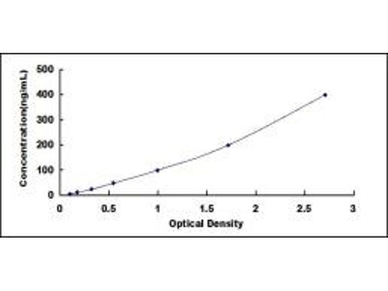 2. Standard - Reconstitute the Standard with 1.0 mL of Standard Diluent, keep for 10 minutes at room temperature, shake gently (not to foam). The concentration of the standard in the stock solution is 400 ng/mL. Prepare 7 tubes containing 0.5 mL Standard Diluent and produce a double dilution series. Mix each tube thoroughly before the next transfer. Set up 7 points of diluted standard such as 400 ng/mL, 200 ng/mL, 100 ng/mL, 50 ng/mL, 25 ng/mL, 12.5 ng/mL, 6.25 ng/mL, and the last microcentrifuge tube with Standard Diluent is the blank as 0 ng/mL.