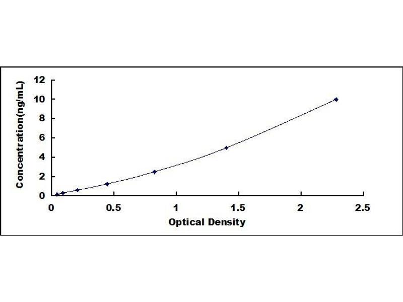 2. Standard - Reconstitute the Standard with 1.0 mL of Standard Diluent, keep for 10 minutes at room temperature, shake gently (not to foam). The concentration of the standard in the stock solution is 40 ng/mL. Firstly dilute the stock solution to 10 ng/mL and the diluted standard serves as the highest standard (10 ng/mL). Then prepare 7 tubes containing 0.5 mL Standard Diluent and use the diluted standard to produce a double dilution series. Mix each tube thoroughly before the next transfer. Set up 7 points of diluted standard such as 10 ng/mL, 5 ng/mL, 2.5 ng/mL, 1.25 ng/mL, 0.625 ng/mL, 0.312 ng/mL, 0.156 ng/mL, and the last microcentrifuge tube with Standard Diluent is the blank as 0 ng/mL.