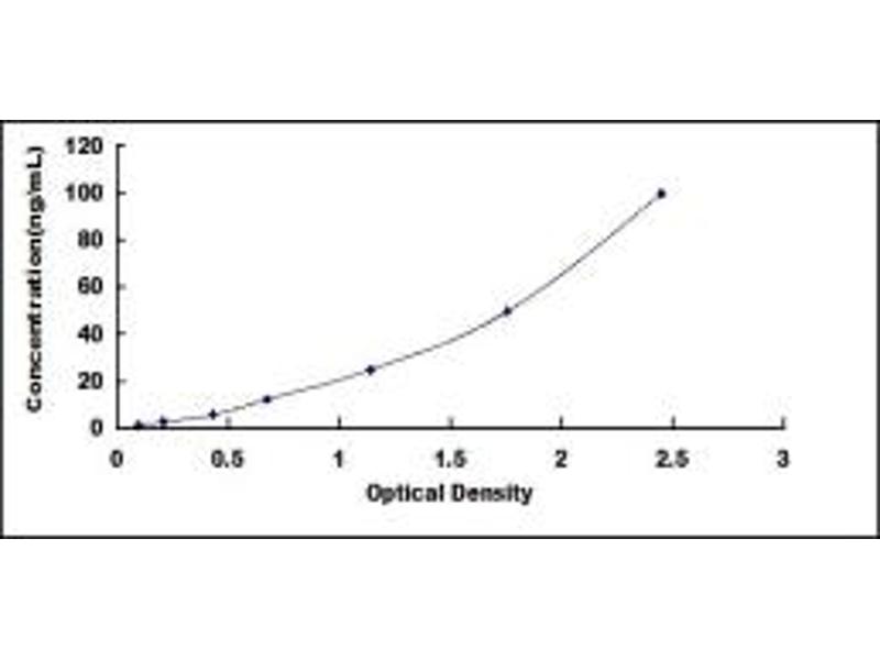 2. Standard - Reconstitute the Standard with 1.0 mL of Standard Diluent, keep for 10 minutes at room temperature, shake gently (not to foam). The concentration of the standard in the stock solution is 100 ng/mL. Prepare 7 tubes containing 0.5 mL Standard Diluent and produce a double dilution series. Mix each tube thoroughly before the next transfer. Set up 7 points of diluted standard such as 100 ng/mL, 50 ng/mL, 25 ng/mL, 12.5 ng/mL, 6.25 ng/mL, 3.12 ng/mL, 1.56 ng/mL, and the last microcentrifuge tube with Standard Diluent is the blank as 0 ng/mL.