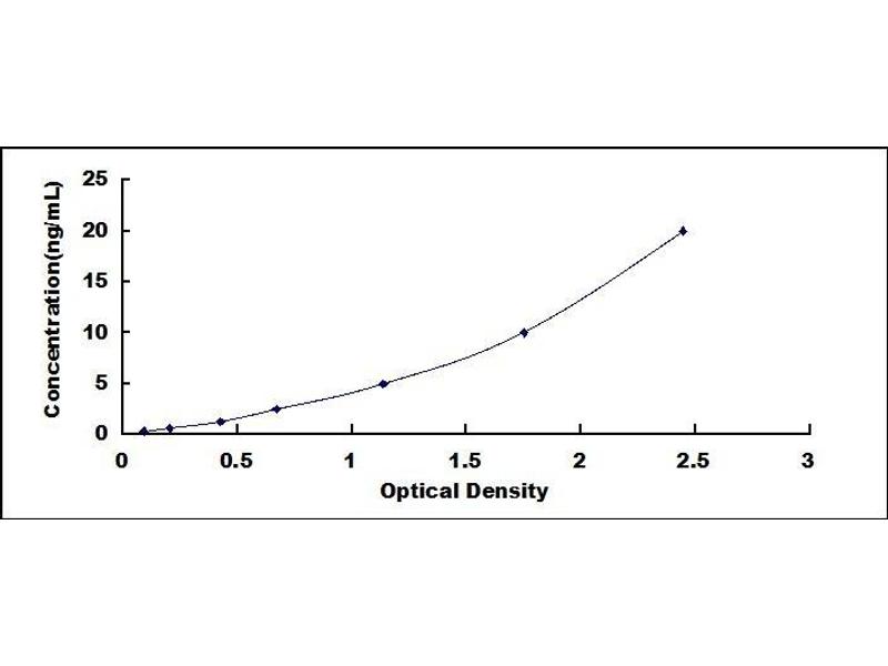 2. Standard - Reconstitute the Standard with 1.0 mL of Standard Diluent, keep for 10 minutes at room temperature, shake gently (not to foam). The concentration of the standard in the stock solution is 80 ng/mL. Firstly dilute the stock solution to 20 ng/mL and the diluted standard serves as the highest standard (20 ng/mL). Then prepare 7 tubes containing 0.5 mL Standard Diluent and use the diluted standard to produce a double dilution series. Mix each tube thoroughly before the next transfer. Set up 7 points of diluted standard such as 20 ng/mL, 10 ng/mL, 5 ng/mL, 2.5 ng/mL, 1.25 ng/mL, 0.625 ng/mL, 0.312 ng/mL, and the last microcentrifuge tube with Standard Diluent is the blank as 0 ng/mL.