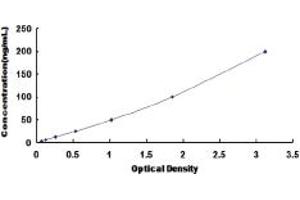 In order to make the calculation easier, we plot the O.D. value of the standard (X-axis) against the log of concentration of the standard (Y-axis), although concentration is the independent variable and O.D. value is the dependent variable. The O.D. values of the standard curve may vary according to the conditions of assay performance (e.g. operator, pipetting technique, washing technique or temperature effects). Typical standard curve below is provided for reference only. -