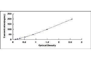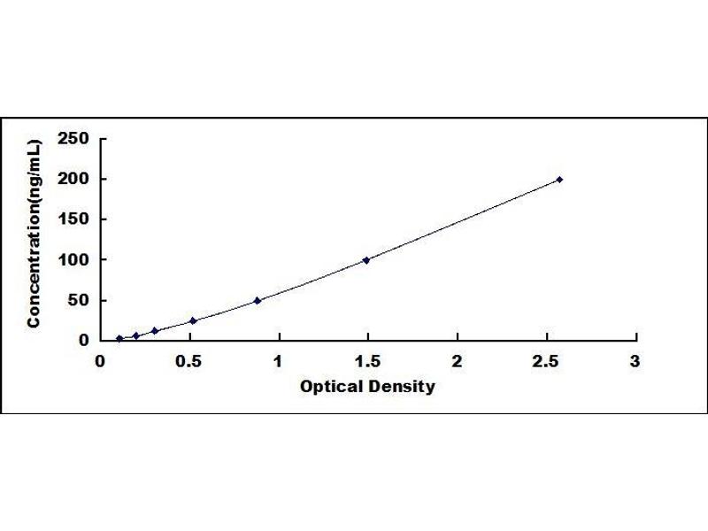 In order to make the calculation easier, we plot the O.D. value of the standard (X-axis) against the log of concentration of the standard (Y-axis), although concentration is the independent variable and O.D. value is the dependent variable. The O.D. values of the standard curve may vary according to the conditions of assay performance (e.g. operator, pipetting technique, washing technique or temperature effects). Typical standard curve below is provided for reference only. -