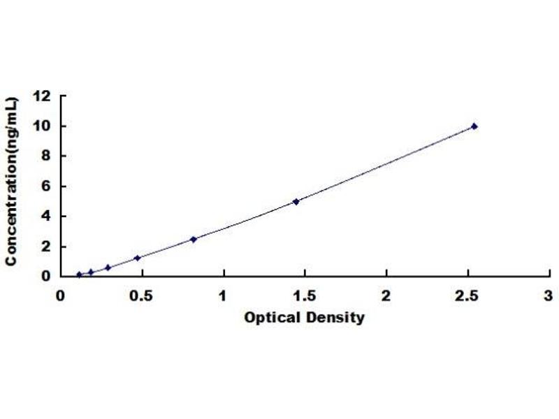 2. Standard - Reconstitute the Standard with 1.0 mL of Standard Diluent, keep for 10 minutes at room temperature, shake gently (not to foam). The concentration of the standard in the stock solution is 10 ng/mL. Prepare 7 tubes containing 0.5 mL Standard Diluent and produce a double dilution series. Mix each tube thoroughly before the next transfer. Set up 7 points of diluted standard such as 10 ng/mL, 5 ng/mL, 2.5 ng/mL, 1.25 ng/mL, 0.625 ng/mL, 0.312 ng/mL, 0.156 ng/mL, and the last microcentrifuge tube with Standard Diluent is the blank as 0 ng/mL.