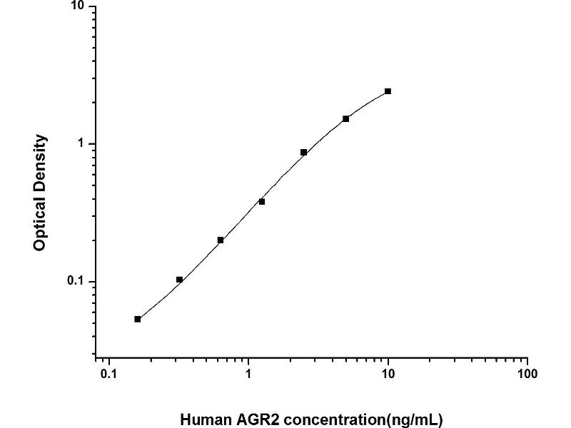 Intra-assay Precision (Precision within an assay): 3 samples with low, mid range and high level Human AGR2 were tested 20 times on one plate, respectively. Inter-assay Precision (Precision between assays): 3 samples with low, mid range and high level Human AGR2 were tested on 3 different plates, 20 replicates in each plate. Both intra-CV and inter-CV are < 10 %.