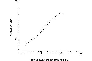 Intra-assay Precision (Precision within an assay): 3 samples with low, mid range and high level Human KLK7 were tested 20 times on one plate, respectively. Inter-assay Precision (Precision between assays): 3 samples with low, mid range and high level Human KLK7 were tested on 3 different plates, 20 replicates in each plate. Both intra-CV and inter-CV are < 10 %.