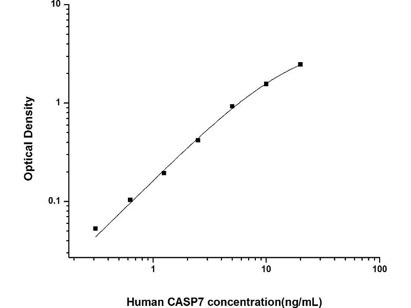 Intra-assay Precision (Precision within an assay): 3 samples with low, mid range and high level Human CASP7 were tested 20 times on one plate, respectively. Inter-assay Precision (Precision between assays): 3 samples with low, mid range and high level Human CASP7 were tested on 3 different plates, 20 replicates in each plate. Both intra-CV and inter-CV are < 10 %.