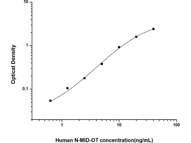 Intra-assay Precision (Precision within an assay): 3 samples with low, mid range and high level Human N-MID-OT were tested 20 times on one plate, respectively. Inter-assay Precision (Precision between assays): 3 samples with low, mid range and high level Human N-MID-OT were tested on 3 different plates, 20 replicates in each plate. Both intra-CV and inter-CV are < 10 %.