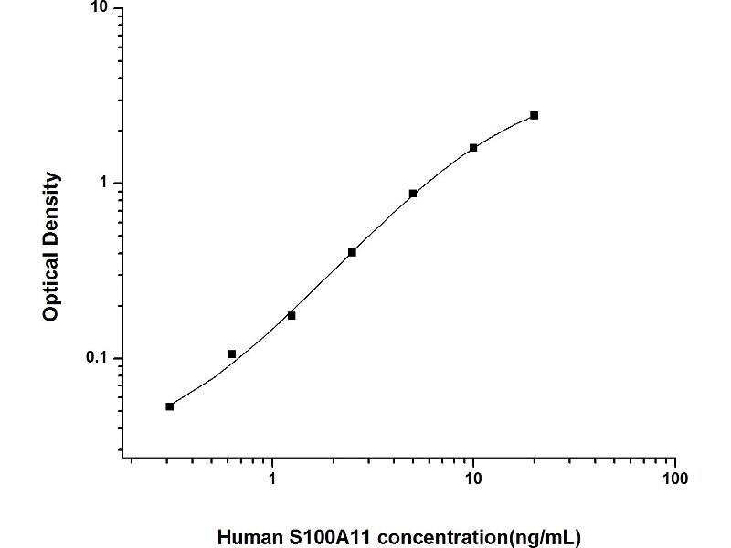 Intra-assay Precision (Precision within an assay): 3 samples with low, mid range and high level Human S100A11 were tested 20 times on one plate, respectively. Inter-assay Precision (Precision between assays): 3 samples with low, mid range and high level Human S100A11 were tested on 3 different plates, 20 replicates in each plate. Both intra-CV and inter-CV are < 10 %.