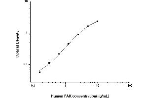 Intra-assay Precision (Precision within an assay): 3 samples with low, mid range and high level Human FAK were tested 20 times on one plate, respectively. Inter-assay Precision (Precision between assays): 3 samples with low, mid range and high level Human FAK were tested on 3 different plates, 20 replicates in each plate. Both intra-CV and inter-CV are < 10 %.