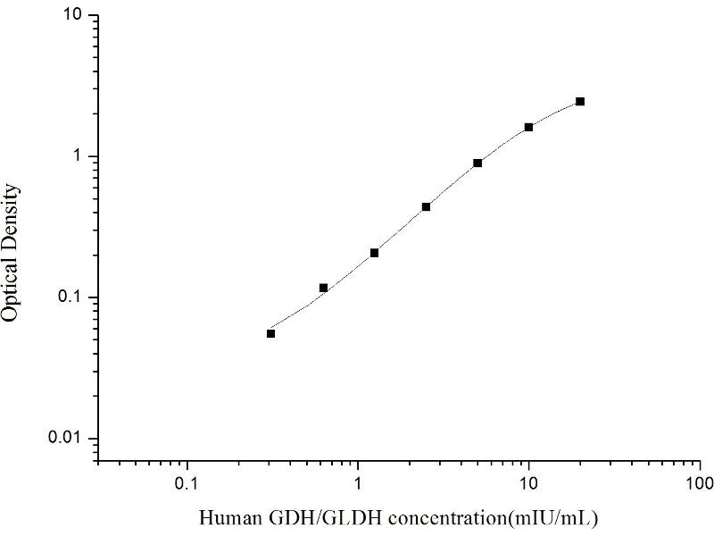 Intra-assay Precision (Precision within an assay): 3 samples with low, mid range and high level Human GDH/GLDH were tested 20 times on one plate, respectively. Inter-assay Precision (Precision between assays): 3 samples with low, mid range and high level Human GDH/GLDH were tested on 3 different plates, 20 replicates in each plate. Both intra-CV and inter-CV are < 10 %.
