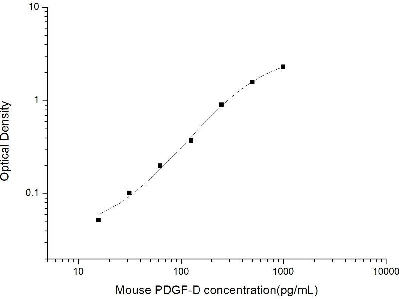 Intra-assay Precision (Precision within an assay): 3 samples with low, mid range and high level Mouse PDGF-D were tested 20 times on one plate, respectively. Inter-assay Precision (Precision between assays): 3 samples with low, mid range and high level Mouse PDGF-D were tested on 3 different plates, 20 replicates in each plate. Both intra-CV and inter-CV are < 10 %.