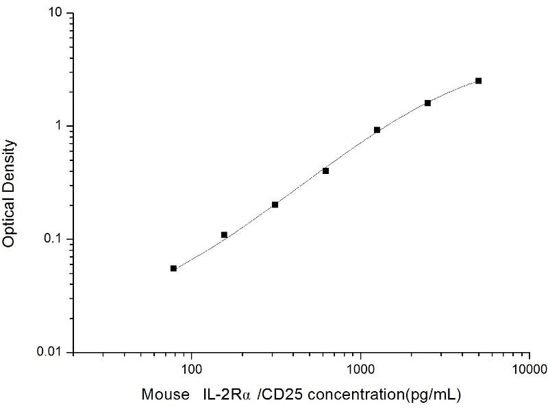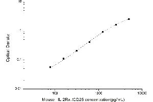 Intra-assay Precision (Precision within an assay): 3 samples with low, mid range and high level Mouse Interleukin-2 Receptor alpha chain were tested 20 times on one plate, respectively. Inter-assay Precision (Precision between assays): 3 samples with low, mid range and high level Mouse Interleukin-2 Receptor alpha chain were tested on 3 different plates, 20 replicates in each plate. Both intra-CV and inter-CV are < 10 %.