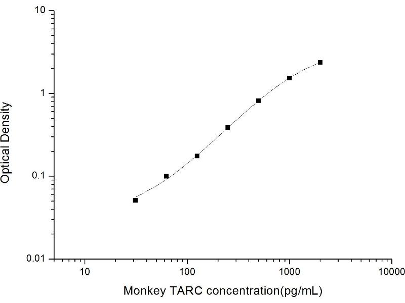 Intra-assay Precision (Precision within an assay): 3 samples with low, mid range and high level Monkey TARC were tested 20 times on one plate, respectively. Inter-assay Precision (Precision between assays): 3 samples with low, mid range and high level Monkey TARC were tested on 3 different plates, 20 replicates in each plate. Both intra-CV and inter-CV are < 10 %.