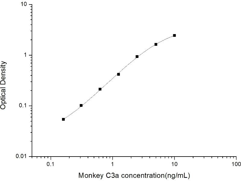 Intra-assay Precision (Precision within an assay): 3 samples with low, mid range and high level Monkey C3a were tested 20 times on one plate, respectively. Inter-assay Precision (Precision between assays): 3 samples with low, mid range and high level Monkey C3a were tested on 3 different plates, 20 replicates in each plate. Both intra-CV and inter-CV are < 10 %.