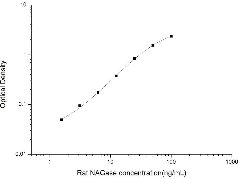 Intra-assay Precision (Precision within an assay): 3 samples with low, mid range and high level Rat NAGase were tested 20 times on one plate, respectively. Inter-assay Precision (Precision between assays): 3 samples with low, mid range and high level Rat NAGase were tested on 3 different plates, 20 replicates in each plate. Both intra-CV and inter-CV are < 10 %.