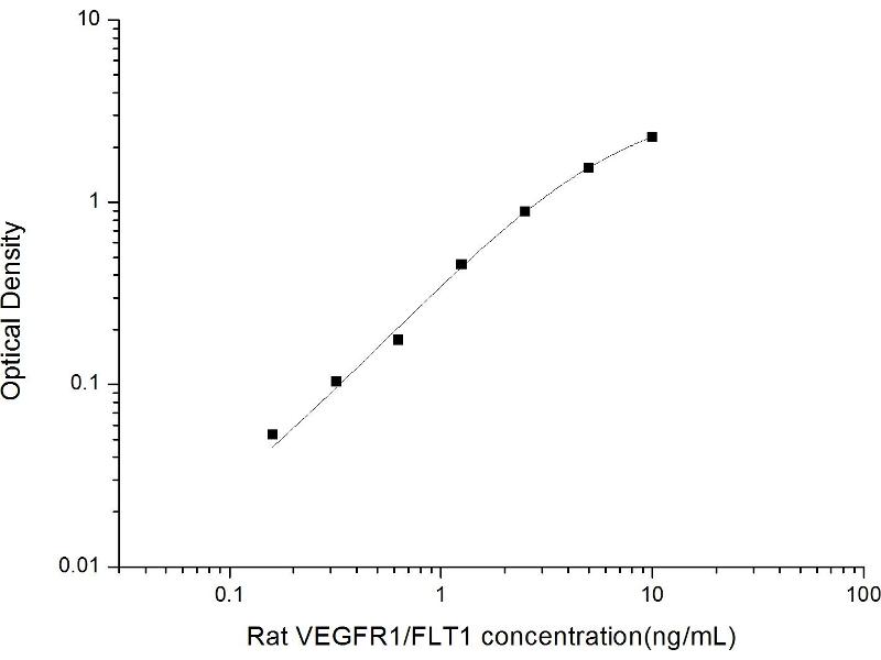 Intra-assay Precision (Precision within an assay): 3 samples with low, mid range and high level Rat VEGFR1/FLT1 were tested 20 times on one plate, respectively. Inter-assay Precision (Precision between assays): 3 samples with low, mid range and high level Rat VEGFR1/FLT1 were tested on 3 different plates, 20 replicates in each plate. Both intra-CV and inter-CV are < 10 %.