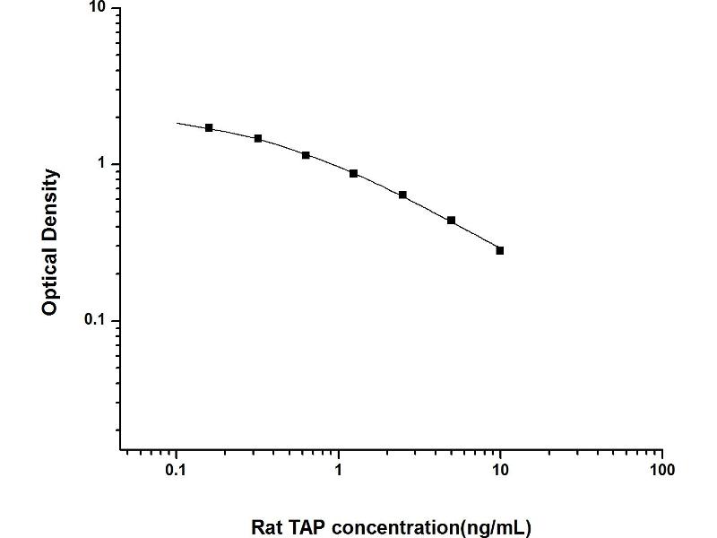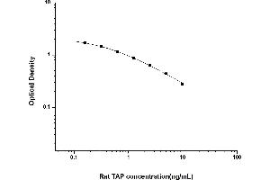 Intra-assay Precision (Precision within an assay): 3 samples with low, mid range and high level Rat TAP were tested 20 times on one plate, respectively. Inter-assay Precision (Precision between assays): 3 samples with low, mid range and high level Rat TAP were tested on 3 different plates, 20 replicates in each plate. Both intra-CV and inter-CV are < 10 %.