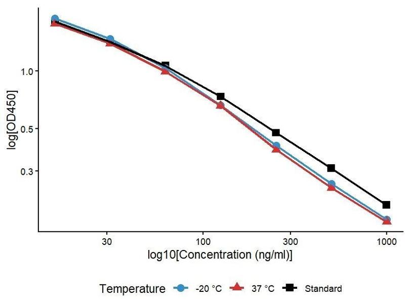 For unopened kit: All reagents should be stored according to the labels on the vials, so they are stable up to 12 months after receipt of the kit. The reference standard, biotinylated detection antibody, HRP conjugate, and 96-well strip plate should be stored at -20 °C upon receipt, while the other reagents should be stored at 4 °C.