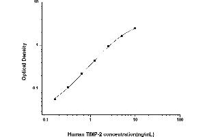 Intra-assay Precision (Precision within an assay): 3 samples with low, mid range and high level Human TIMP-2 were tested 20 times on one plate, respectively. Inter-assay Precision (Precision between assays): 3 samples with low, mid range and high level Human TIMP-2 were tested on 3 different plates, 20 replicates in each plate. Both intra-CV and inter-CV are < 10 %.