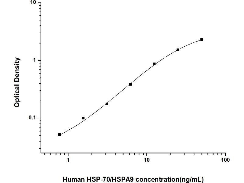 Intra-assay Precision (Precision within an assay): 3 samples with low, mid range and high level Human HSP-70/HSPA9 were tested 20 times on one plate, respectively. Inter-assay Precision (Precision between assays): 3 samples with low, mid range and high level Human HSP-70/HSPA9 were tested on 3 different plates, 20 replicates in each plate. Both intra-CV and inter-CV are < 10 %.