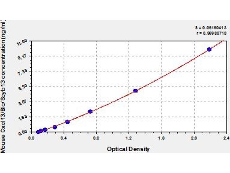 - This assay has high sensitivity and excellent specificity for detection of mouse Cxcl13/Blc/Scyb13. No significant cross-reactivity or interference between mouse Cxcl13/Blc/Scyb13 and analogues was observed. Note: Limited by current skills and knowledge, it is impossible for us to complete the cross-reactivity detection between mouse Cxcl13/Blc/Scyb13 and all the analogues, therefore, cross reaction may still exist.