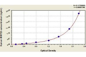 - This assay has high sensitivity and excellent specificity for detection of human MMP20. No significant cross-reactivity or interference between human MMP20 and analogues was observed. Note: Limited by current skills and knowledge, it is impossible for us to complete the cross-reactivity detection between human MMP20 and all the analogues, therefore, cross reaction may still exist.