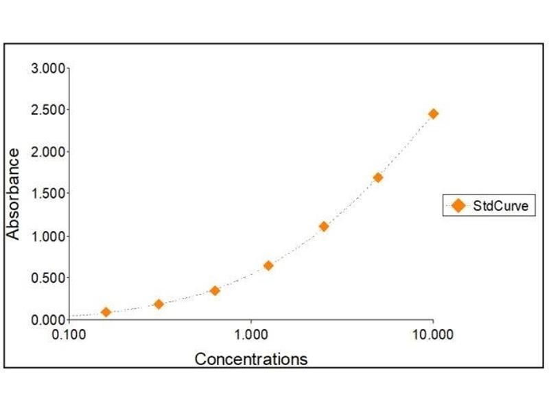 All samples and standards should be assayed in duplicates. 2. The Standards and the test sample(s) should be loaded into the ELISA wells as quickly as possible to avoid a shift in OD readings. Using a multichannel pipette would reduce this occurrence. Pipette 100 μL of Standard 0 (0.0 ng/mL) in duplicate Standard 1 (0.16 ng/mL) in duplicate Standard 2 (0.31 ng/mL) in duplicate Standard 3 (0.63 ng/mL) in duplicate Standard 4 (1.25 ng/mL) in duplicate Standard 5 (2.50 ng/mL) in duplicate Standard 6 (5 ng/mL) in duplicate Standard 7 (10 ng/mL) in duplicate 3. Pipette 100 μL of sample (in duplicate) into pre designated wells. 4. Incubate the micro titer plate while shaking at 400rpm on a microplate shaker at room temperature for one hundred and twenty (120 ± 2) minutes. Keep plate covered and level during incubation. 5. Following incubation, aspirate the contents of the wells. 6. Completely fill each well with appropriately diluted Wash Solution and aspirate. Repeat three times, for a total of four washes. If washing manually: completely fill wells with wash buffer, invert the plate then pour/shake out the contents in a waste container. Follow this by sharply striking the wells on absorbent paper to remove residual buffer. Repeat 3 times for a total of four washes. 7. Pipette 100 μL of appropriately diluted Detection Antibody to each well. Incubate while shaking at 400rpm on a microplate shaker at room temperature for twenty (20 ± 2) minutes. Keep plate covered in the dark and level during incubation. 8. Wash and blot the wells as described in Steps 5/6. 9. Pipette 100 μL of appropriately diluted HRP-streptavidin to each well. Incubate while shaking at 400rpm on a microplate shaker at room temperature for twenty (20 ± 2) minutes. Keep plate covered in the dark and level during incubation. 10. Wash and blot the wells as described in Steps 5/6. 11. Pipette 100 μL of TMB Substrate Solution into each well. 12. Incubate while shaking at 400rpm on a microplate shaker in the dark at room temperature for precisely ten (10) minutes. 13. After ten minutes, add 100 μL of Stop Solution to each well. 14. Determine the absorbance (450 nm) of the contents of each well within 30 minutes. Calibrate the plate reader to manufacturer’s specifications.