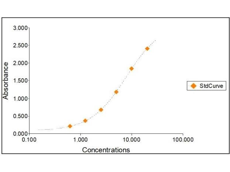 All samples and standards should be assayed in duplicates. 2. The Standards and the test sample(s) should be loaded into the ELISA wells as quickly as possible to avoid a shift in OD readings. Using a multichannel pipette would reduce this occurrence. Pipette 100 μL of Standard 0 (0.0 ng/mL) in duplicate Standard 1 (0.63 ng/mL) in duplicate Standard 2 (1.25 ng/mL) in duplicate Standard 3 (2.50 ng/mL) in duplicate Standard 4 (5 ng/mL) in duplicate Standard 5 (10 ng/mL) in duplicate Standard 6 (20 ng/mL) in duplicate 3. Pipette 100 μL of sample (in duplicate) into pre designated wells. 4. Incubate the micro titer plate at room temperature for forty (40 ± 2) minutes. Keep plate covered and level during incubation. 5. Following incubation, aspirate the contents of the wells. 6. Completely fill each well with appropriately diluted Wash Solution and aspirate. Repeat three times, for a total of four washes. If washing manually: completely fill wells with wash buffer, invert the plate then pour/shake out the contents in a waste container. Follow this by sharply striking the wells on absorbent paper to remove residual buffer. Repeat 3 times for a total of four washes. 7. Pipette 100 μL of appropriately diluted Enzyme-Antibody Conjugate to each well. Incubate at room temperature for twenty (20 ± 2) minutes. Keep plate covered in the dark and level during incubation. 8. Wash and blot the wells as described in Steps 5/6. 9. Pipette 100 μL of TMB Substrate Solution into each well. 10. Incubate in the dark at room temperature for precisely ten (10) minutes. 11. After ten minutes, add 100 μL of Stop Solution to each well. 12. Determine the absorbance (450 nm) of the contents of each well within 30 minutes. Calibrate the plate reader to manufacturer’s specifications.