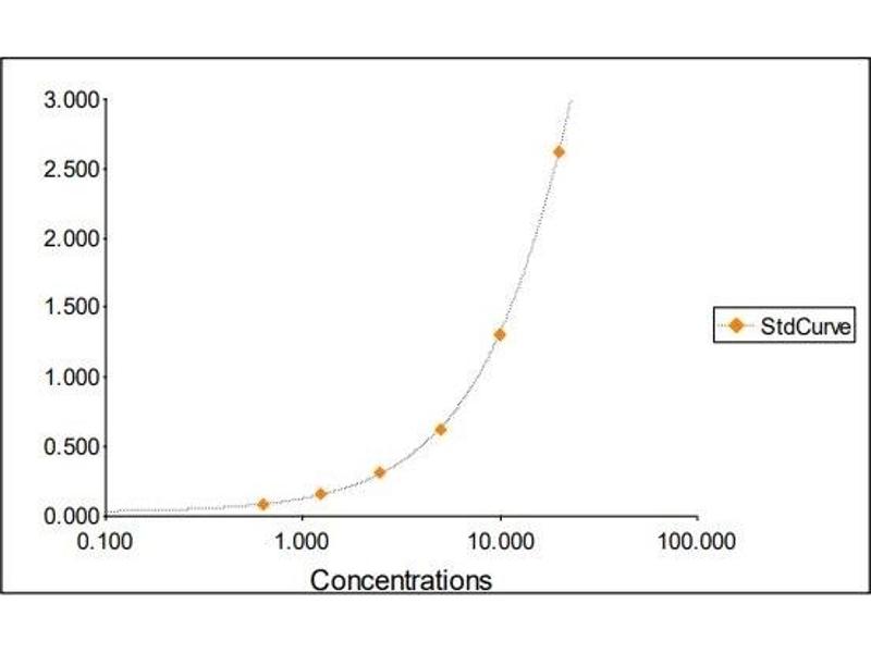 2. The Standards and the test sample(s) should be loaded into the ELISA wells as quickly as possible to avoid a shift in OD readings. Using a multichannel pipette would reduce this occurrence. Pipette 100 μL of Standard 0 (0.0 ng/mL) in duplicate Standard 1 (0.63 ng/mL) in duplicate Standard 2 (1.25 ng/mL) in duplicate Standard 3 (2.50 ng/mL) in duplicate Standard 4 (5 ng/mL) in duplicate Standard 5 (10 ng/mL) in duplicate Standard 6 (20 ng/mL) in duplicate