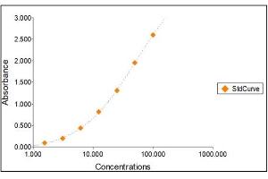 2. The Standards and the test sample(s) should be loaded into the ELISA wells as quickly as possible to avoid a shift in OD readings. Using a multichannel pipette would reduce this occurrence. Pipette 100 μL of Standard 0 (0.0 ng/mL) in duplicate Standard 1 (1.56 ng/mL) in duplicate Standard 2 (3.13 ng/mL) in duplicate Standard 3 (6.25 ng/mL) in duplicate Standard 4 (12.50 ng/mL) in duplicate Standard 5 (25 ng/mL) in duplicate Standard 6 (50 ng/mL) in duplicate Standard 7 (100 ng/mL) in duplicate