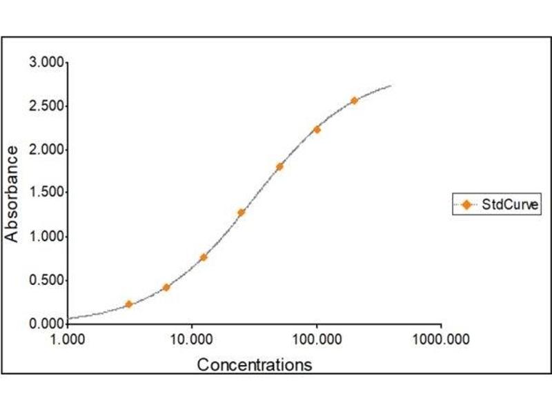 In this assay the IgG2c present in samples reacts with the anti-IgG2c antibodies, which have been adsorbed to the surface of polystyrene microtitre wells. After the removal of unbound proteins by washing, anti-IgG2c antibodies conjugated with horseradish peroxidase (HRP) are added. These enzyme-labeled antibodies form complexes with the previously bound IgG2c. Following another washing step, the enzyme bound to the immunosorbent is assayed by the addition of a chromogenic substrate, 3,3’,5,5’-tetramethylbenzidine (TMB). The quantity of bound enzyme varies directly with the concentration of IgG2c in the sample tested; thus, the absorbance, at 450 nm, is a measure of the concentration of IgG2c in the test sample. The quantity of IgG2c in the test sample can be interpolated from the standard curve constructed from the standards, and corrected for sample dilution.