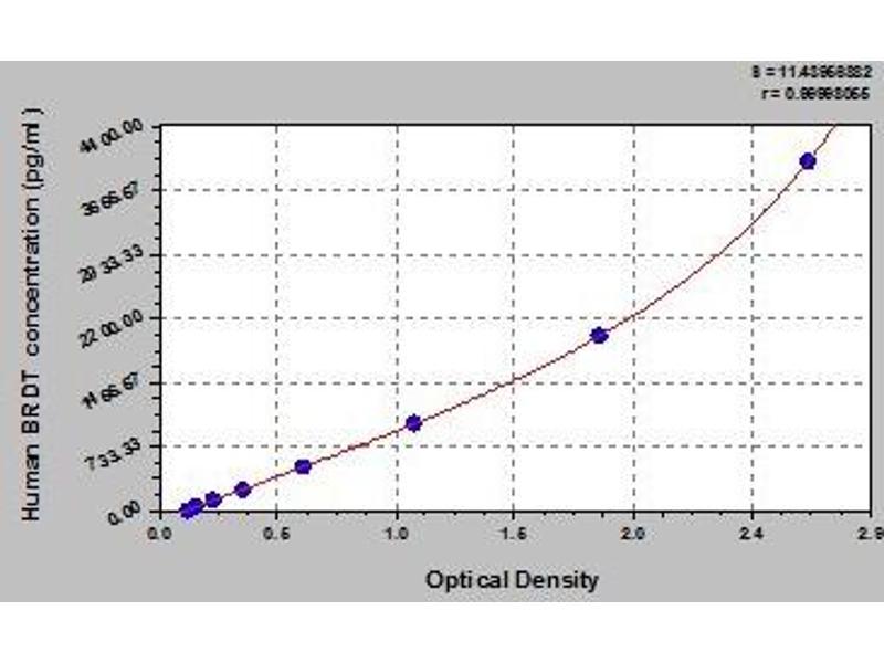 - Antibody specific for BRDT has been pre-coated onto a microplate. Standards and samples are pipetted into the wells and any BRDT present is bound by the immobilized antibody. After removing any unbound substances, a biotin-conjugated antibody specific for BRDT is added to the wells. After washing, avidin conjugated Horseradish Peroxidase (HRP) is added to the wells. Following a wash to remove any unbound avidin-enzyme reagent, a substrate solution is added to the wells and color develops in proportion to the amount of BRDT bound in the initial step. The color development is stopped and the intensity of the color is measured.