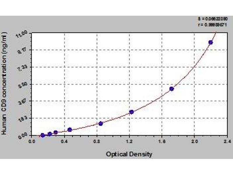 - Antibody specific for CD9 has been pre-coated onto a microplate. Standards and samples are pipetted into the wells and any CD9 present is bound by the immobilized antibody. After removing any unbound substances, a biotin-conjugated antibody specific for CD9 is added to the wells. After washing, avidin conjugated Horseradish Peroxidase (HRP) is added to the wells. Following a wash to remove any unbound avidin-enzyme reagent, a substrate solution is added to the wells and color develops in proportion to the amount of CD9 bound in the initial step. The color development is stopped and the intensity of the color is measured.