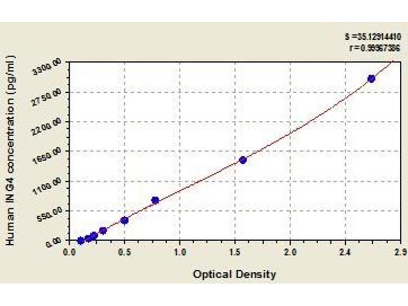 - Antibody specific for ING4 has been pre-coated onto a microplate. Standards and samples are pipetted into the wells and any ING4 present is bound by the immobilized antibody. After removing any unbound substances, a biotin-conjugated antibody specific for ING4 is added to the wells. After washing, avidin conjugated Horseradish Peroxidase (HRP) is added to the wells. Following a wash to remove any unbound avidin-enzyme reagent, a substrate solution is added to the wells and color develops in proportion to the amount of ING4 bound in the initial step. The color development is stopped and the intensity of the color is measured.