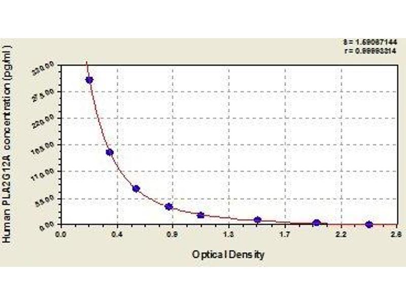 - Antibody specific for PLA2G12A has been pre-coated onto a microplate. Standards and samples are pipetted into the wells and any PLA2G12A present is bound by the immobilized antibody. After removing any unbound substances, a biotin-conjugated antibody specific for PLA2G12A is added to the wells. After washing, avidin conjugated Horseradish Peroxidase (HRP) is added to the wells. Following a wash to remove any unbound avidin-enzyme reagent, a substrate solution is added to the wells and color develops in proportion to the amount of PLA2G12A bound in the initial step. The color development is stopped and the intensity of the color is measured.