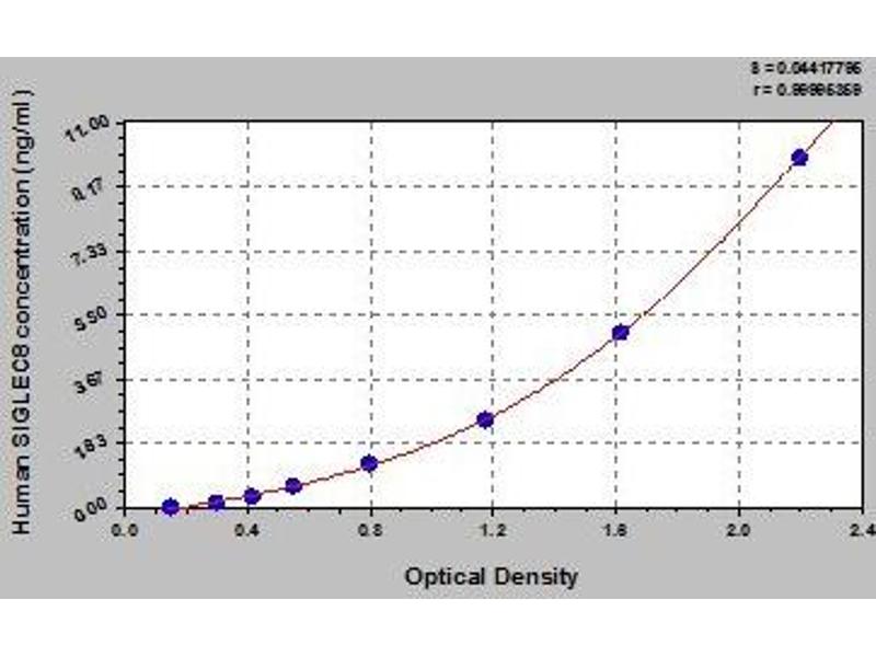 - Antibody specific for SIGLEC8 has been pre-coated onto a microplate. Standards and samples are pipetted into the wells and any SIGLEC8 present is bound by the immobilized antibody. After removing any unbound substances, a biotin-conjugated antibody specific for SIGLEC8 is added to the wells. After washing, avidin conjugated Horseradish Peroxidase (HRP) is added to the wells. Following a wash to remove any unbound avidin-enzyme reagent, a substrate solution is added to the wells and color develops in proportion to the amount of SIGLEC8 bound in the initial step. The color development is stopped and the intensity of the color is measured.