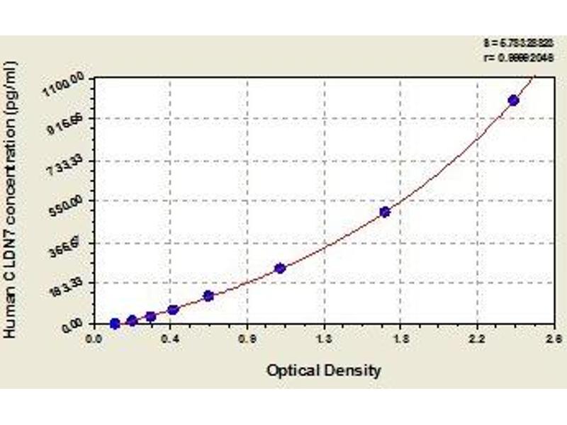- Antibody specific for CLDN7 has been pre-coated onto a microplate. Standards and samples are pipetted into the wells and any CLDN7 present is bound by the immobilized antibody. After removing any unbound substances, a biotin-conjugated antibody specific for CLDN7 is added to the wells. After washing, avidin conjugated Horseradish Peroxidase (HRP) is added to the wells. Following a wash to remove any unbound avidin-enzyme reagent, a substrate solution is added to the wells and color develops in proportion to the amount of CLDN7 bound in the initial step. The color development is stopped and the intensity of the color is measured.