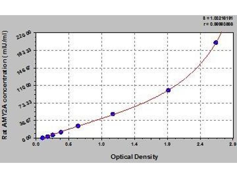 - Antibody specific for AMY2A has been pre-coated onto a microplate. Standards and samples are pipetted into the wells and any AMY2A present is bound by the immobilized antibody. After removing any unbound substances, a biotin-conjugated antibody specific for AMY2A is added to the wells. After washing, avidin conjugated Horseradish Peroxidase (HRP) is added to the wells. Following a wash to remove any unbound avidin-enzyme reagent, a substrate solution is added to the wells and color develops in proportion to the amount of AMY2A bound in the initial step. The color development is stopped and the intensity of the color is measured.