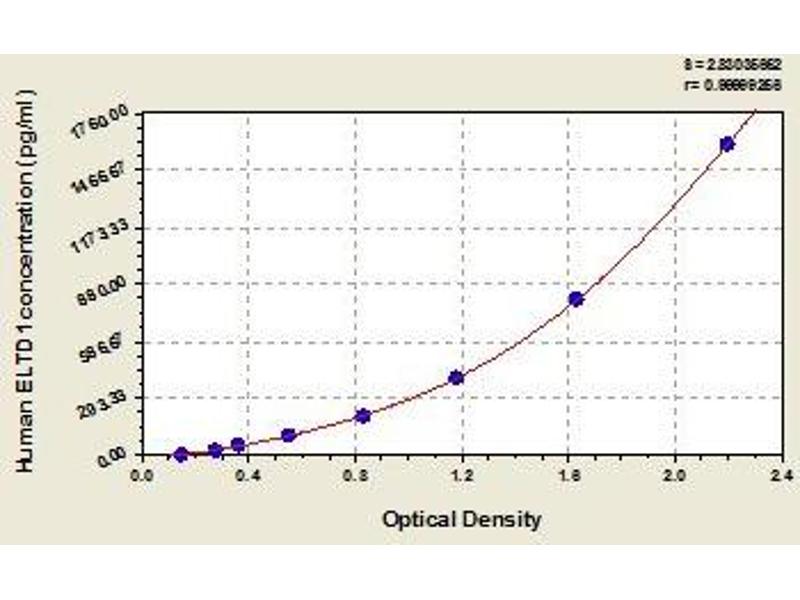 - Antibody specific for ELTD1 has been pre-coated onto a microplate. Standards and samples are pipetted into the wells and any ELTD1 present is bound by the immobilized antibody. After removing any unbound substances, a biotin-conjugated antibody specific for ELTD1 is added to the wells. After washing, avidin conjugated Horseradish Peroxidase (HRP) is added to the wells. Following a wash to remove any unbound avidin-enzyme reagent, a substrate solution is added to the wells and color develops in proportion to the amount of ELTD1 bound in the initial step. The color development is stopped and the intensity of the color is measured.