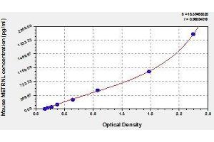 - Antibody specific for METRNL has been pre-coated onto a microplate. Standards and samples are pipetted into the wells and any METRNL present is bound by the immobilized antibody. After removing any unbound substances, a biotin-conjugated antibody specific for METRNL is added to the wells. After washing, avidin conjugated Horseradish Peroxidase (HRP) is added to the wells. Following a wash to remove any unbound avidin-enzyme reagent, a substrate solution is added to the wells and color develops in proportion to the amount of METRNL bound in the initial step. The color development is stopped and the intensity of the color is measured.