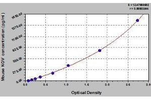 This assay employs the quantitative sandwich enzyme immunoassay technique. Antibody specific for NOV has been pre-coated onto a microplate. Standards and samples are pipetted into the wells and any NOV present is bound by the immobilized antibody. After removing any unbound substances, a biotin-conjugated antibody specific for NOV is added to the wells. After washing, avidin conjugated Horseradish Peroxidase (HRP) is added to the wells. Following a wash to remove any unbound avidin-enzyme reagent, a substrate solution is added to the wells and color develops in proportion to the amount of NOV bound in the initial step. The color development is stopped and the intensity of the color is measured.