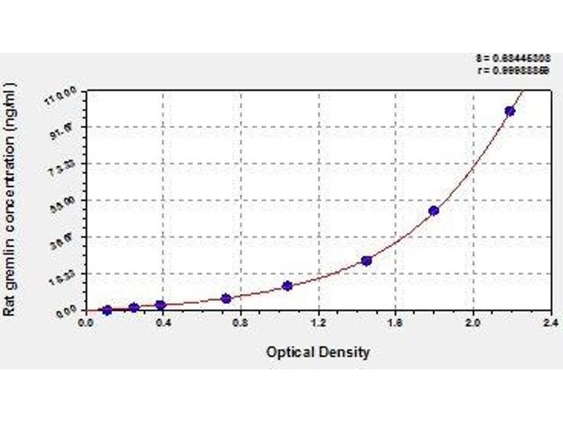Antibody specific for GREM1 has been pre-coated onto a microplate. Standards and samples are pipetted into the wells and any GREM1 present is bound by the immobilized antibody. After removing any unbound substances, a biotin-conjugated antibody specific for GREM1 is added to the wells. After washing, avidin conjugated Horseradish Peroxidase (HRP) is added to the wells. Following a wash to remove any unbound avidin-enzyme reagent, a substrate solution is added to the wells and color develops in proportion to the amount of GREM1 bound in the initial step. The color development is stopped and the intensity of the color is measured.