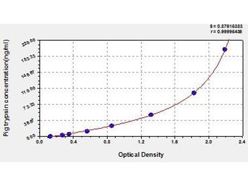 - This assay employs the quantitative sandwich enzyme immunoassay technique. Antibody specific for trypsin has been pre-coated onto a microplate. Standards and samples are pipetted into the wells and any trypsin present is bound by the immobilized antibody. After removing any unbound substances, a biotin-conjugated antibody specific for trypsin is added to the wells. After washing, avidin conjugated Horseradish Peroxidase (HRP) is added to the wells. Following a wash to remove any unbound avidin-enzyme reagent, a substrate solution is added to the wells and color develops in proportion to the amount of trypsin bound in the initial step. The color development is stopped and the intensity of the color is measured.