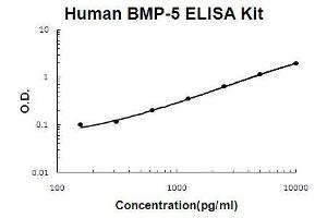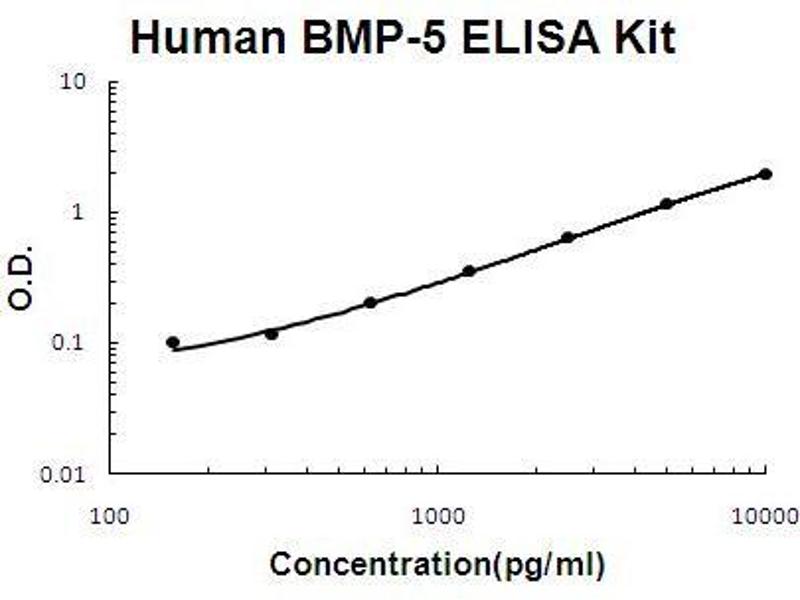 Background: Bone morphogenetic protein 5 is a protein that in humans is encoded by the BMP5 gene.1,2,3 The protein encoded by this gene is member of the TGFbeta superfamily. Bone morphogenetic proteins are known for their ability to induce bone and cartilage development. BMP5 may play a role in certain cancers. Like other BMP's BMP5 is inhibited by chordin and noggin. It is expressed in the trabecular meshwork and optic nerve head and may have a role in the development and normal function. It is also expressed in the lung and liver. BMP-5 is mapped on human chromosome 6.4 The standard used in this kit is recombinant BMP-5 with the monomer molecular mass of 18KDa.