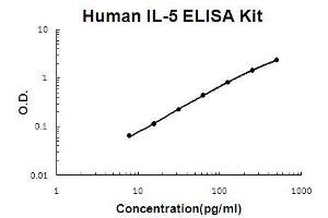 - human IL-5 ELISA Kit was based on standard sandwich enzyme-linked immune-sorbent assay technology. A monoclonal antibody from mouse specific for IL-5 has been precoated onto 96-well plates. Standards(sf21, I20-S134) and test samples are added to the wells, a biotinylated detection polyclonal antibody from goat specific for IL-5 is added subsequently and then followed by washing with PBS or TBS buffer. Avidin-Biotin-Peroxidase Complex was added and unbound conjugates were washed away with PBS or TBS buffer. HRP substrate TMB was used to visualize HRP enzymatic reaction. TMB was catalyzed by HRP to produce a blue color product that changed into yellow after adding acidic stop solution. The density of yellow is proportional to the human IL-5 amount of sample captured in plate.