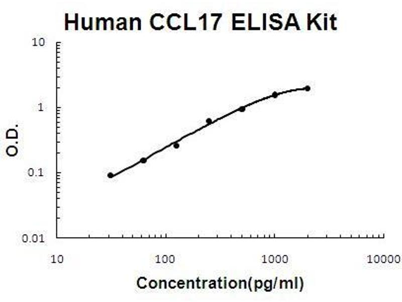 - human CCL17 ELISA Kit was based on standard sandwich enzyme-linked immune-sorbent assay technology. A monoclonal antibody from mouse specific for CCL17 has been precoated onto 96-well plates. Standards(E.coli, A24-S94) and test samples are added to the wells, a biotinylated detection polyclonal antibody from goat specific for CCL17 is added subsequently and then followed by washing with PBS or TBS buffer. Avidin-Biotin-Peroxidase Complex was added and unbound conjugates were washed away with PBS or TBS buffer. HRP substrate TMB was used to visualize HRP enzymatic reaction. TMB was catalyzed by HRP to produce a blue color product that changed into yellow after adding acidic stop solution. The density of yellow is proportional to the human CCL17 amount of sample captured in plate.