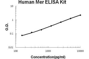 - human Mer ELISA Kit was based on standard sandwich enzyme-linked immune-sorbent assay technology. A monoclonal antibody from mouse specific for Mer has been precoated onto 96-well plates. Standards(sf21, R26-A499) and test samples are added to the wells, a biotinylated detection polyclonal antibody from goat specific for Mer is added subsequently and then followed by washing with PBS or TBS buffer. Avidin-Biotin-Peroxidase Complex was added and unbound conjugates were washed away with PBS or TBS buffer. HRP substrate TMB was used to visualize HRP enzymatic reaction. TMB was catalyzed by HRP to produce a blue color product that changed into yellow after adding acidic stop solution. The density of yellow is proportional to the human Mer amount of sample captured in plate.